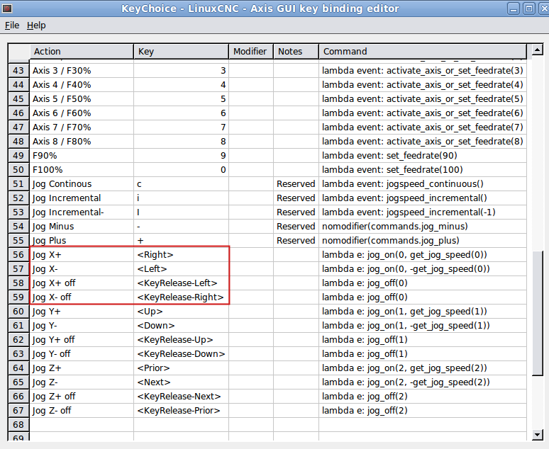 Nemrég megkeresett valaki, hogy szeretné a LinuxCNC eredeti billentyű kiosztását felcserélni az egyik tengelyen, tehát például az X tengely a jobbra mutató nyíl hatására nem pozitív hanem negatív irányba mozdulna el. Most ne nézzük azt, hogy ez jó ötlet-e vagy sem, csak a megvalósításra figyeljünk: