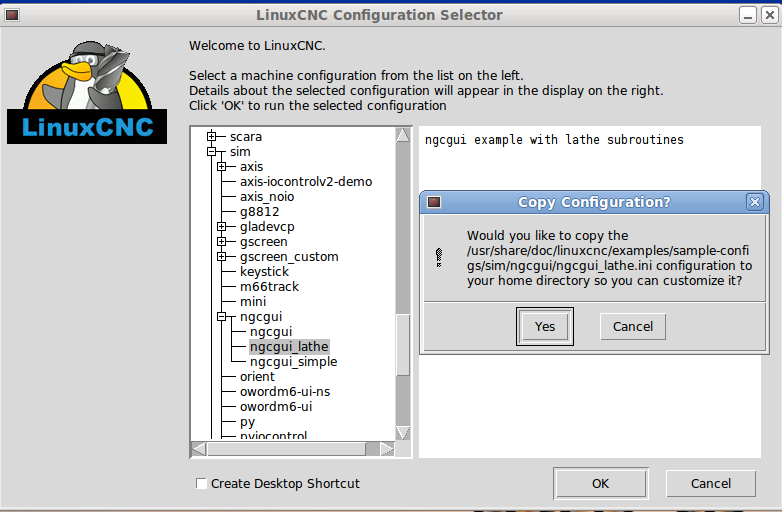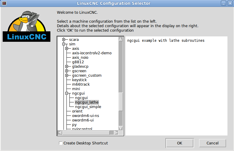 Első lépésként indítsuk el menüből a LinuxCNC-t és válasszuk ki a “Sample Configuration” alatt a “sim” (szimulációs konfigurációk) alatt az “ngcgui_lathe” konfigot! (Eszterga angolul: lathe)