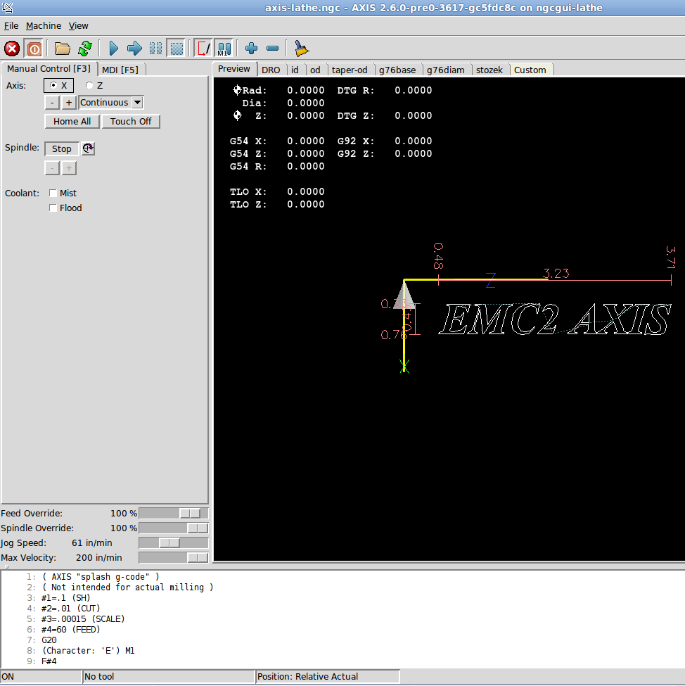 Ha valaki csak “elméletben” akar esztergálni és NGCGUI szubrutinokat tesztelni, akkor itt számára vége is a beállításoknak, ugyanis elindul a szimulált LinuxCNC eszterga és minden kész.